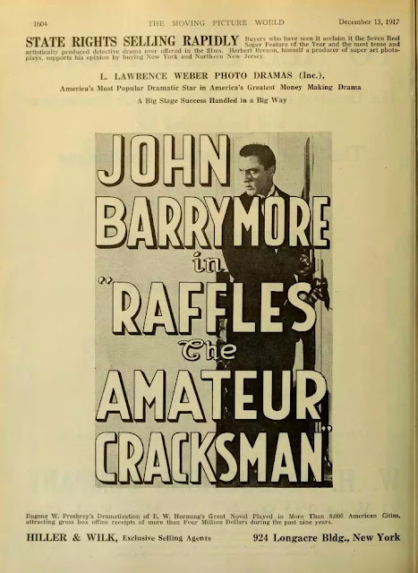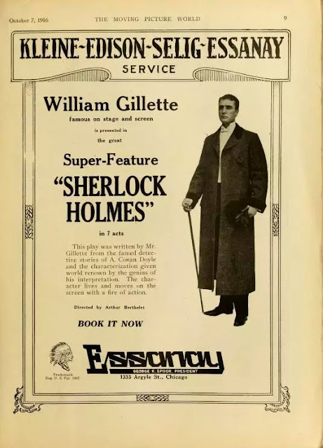 Motography, the motion picture trade journal, reviewed the Sherlock Holme sof 1916, "Much of the photography is very good. A number of bog scenes standout prominently, in which the suspense is cleverly managed. But as a whole, seven reels seems too lengthy. The play drags in the first part and some of the story is vague. The acting is in keeping with the melodramatic situations. Gillette shows himself a clever screen actor in the title role."  Motion Picture World noted that William Gillette was over sixty years of age at the time of its review and at the time of the release of the film. It reviewed "the Photoplay adaptation of his famous play in seven parts" in which he used members of Essanay and of his own stage company, "theater goers will never tire of looking at his characterization of Conan Doyle's Greta detective.. And leave in comparatively permanent form, his Sherlock Holmes for the delight of future generations. Mr. Gillette acts like an old-timer before the camera...The seeming lapses into sleepiness of manner and action suddenly resolve into a display of imperiousness and overwhelming mentality and wit." Sherlock Holmes (Arthur Berthelet, 1916) starring William Gillette, for nearly a century a silent film that if found in magazines has been reported as a lost film in regard to being seen on the movie projection screen, according to Photoplay magazine although not remade was the basis for the film Sherlock Holmes (nine reels) of 1922, starring John Barrymore, John Barrymore not only in the title role but also in a dual role as Moriarty. Photoplay magazine claimed that it was Barrymore's acting ability that was worth seeing, not so much the character itself being portrayed, but added that followers of the Arthur Conan Doyles stories were recommended to see the film, "You should see this film if you are a devotee of John the Barrymore...Albert Parker, the director, has not been afraid to follow his imaginative impulses, with interesting results." As the stories of Edgar Wallace were beginning to appear serialized in The Stand Magazine, alongside  a Sherlock Holmes rejuvenated by its creator after the death of illustrator Sidney Paget, a Sherlock Holmes created by John Barrymore appeared in The Strand Magazine in the interview The Youth of Sherlock Holmes, conducted by Hayden Church during 1922. A photocaption read, "A well known incident from 'A Scandal in Bohemia', the first of the famous Sherlock Holmes stories. John Barrymore's wonderful makeup as the old clergyman is seen to better advantage in the small photograph." Jounalist Hayden church divulged to The Strand, "It was in a bedroom of the Ritz that I discovered Mr. Barrymore, who arrayed in flowered silk pajamas was at that very moment engaged in making up as the great Sherlock." The article explained that there was a prolouge to the film that provided biographical information on the fictional character and his youth that had been left out in the cannon. In the interview, Barrymore explains that the film was shot on location not in Baker Street or Gower Street, but in Torrington Square, for authenticity. "Our film will bring out the romantic side of Holmes...'At the beginning of the hour,'Holmes in our script, 'I met love and it passed me  by. At the end of the hour, I met mysterious evil'" Film Daily magazine during 1922 described the film favorably with the provision, "It is too long and it is not easy to follow the story. In an effort to clarify matters numerous long titles and used that often confuse more than try to explain. The result is a 'talks' picture and if you happen in after the first half reel you are about lost because it's not the kind of story that you can pick up readily." The magazine described the lighting as "sometimes too dark on interiors" and the exteriors as "views of England and Switzerland; splendid". The scenario is listed as having been written by Earle Brown and Marion Fairfax, the cameraman as having been being J. Roy Hunt. In the film, Holmes is seen smoking a pipe in his armchair at 221 B Baker Street with a human skull on the end table where the Conan Doyle often kept his Stradivarius violin, his being seen reading a letter, the later shown in an intercut insert shot. Watson, now married, enters as Holmes reads a newspaper account of his having solved the Darton Mystery, the newspaper also shown in insert shot. There is a globe visible in the far corner of the room, a teapot diagnally in the foreground, and yet, the bust, remaining unidentified, but presumably Roman, can only be espied as a shadow, the light seeming to fall from a window that is blocked by its silhouette. The Persian slipper is on the mantle, ready for when Holmes' is in need of filling his pipe. It is there that Holmes attributes to Moriarty over fourth as of then unsolved mysteries. The film quickly concludes, first by Holmes disguising himself as Moriarty, then as he is removing the greasepaint he apprehended Moriarty, who in turn is in disguise, at that moment his announcing that he is embarking upon his honeymoon.